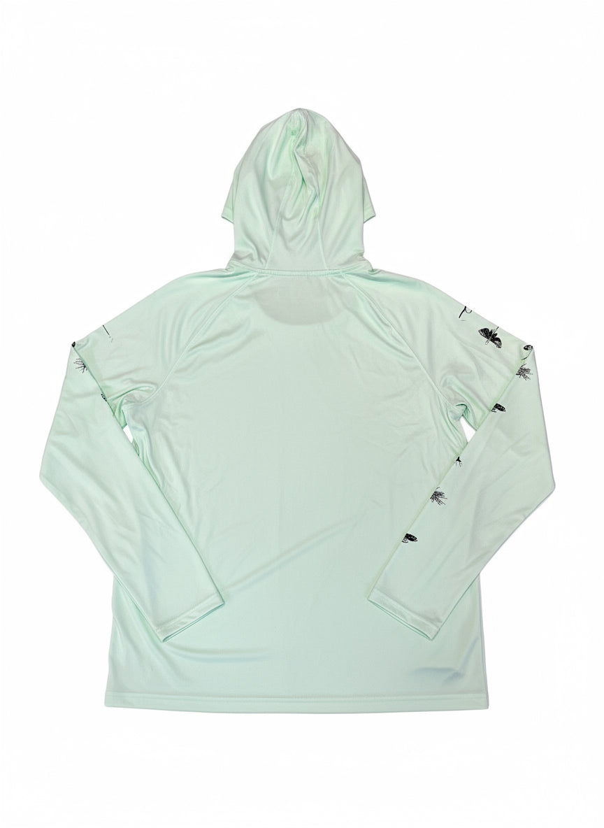 Idaho Rivers Hooded Sun Shirts 30 SPF with entomology of the fly along sleeve and Snake River Nets Logo on the front. Available in LIght grey, blue, Dark grey and light green.