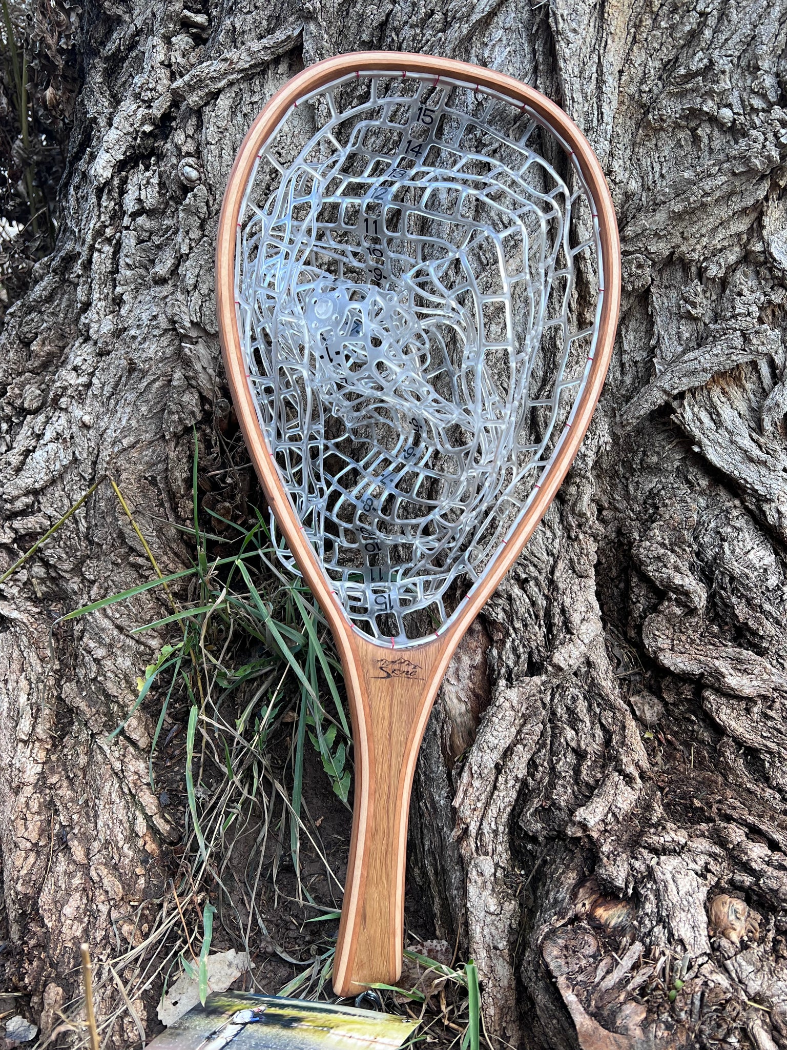 This is the actual net you will receive. The handle is White Oak Wood. The hoop laminates are Cherry and Maple . This net has a fish friendly PVC bag that has ability to measure up to a 30 inch fish in the bag. All nets are finished with Tung oil for easy maintenance and to allow the natural color and feel of the wood.