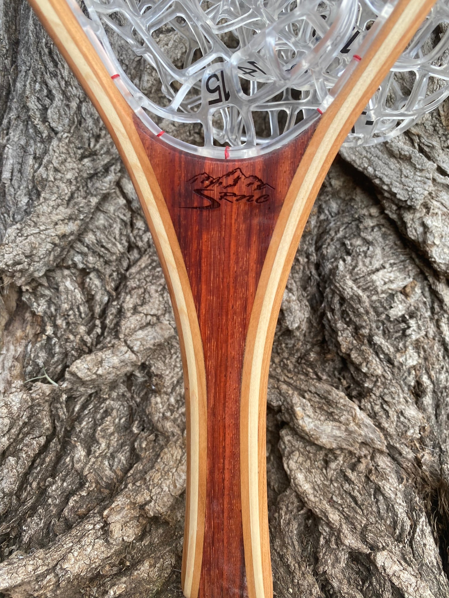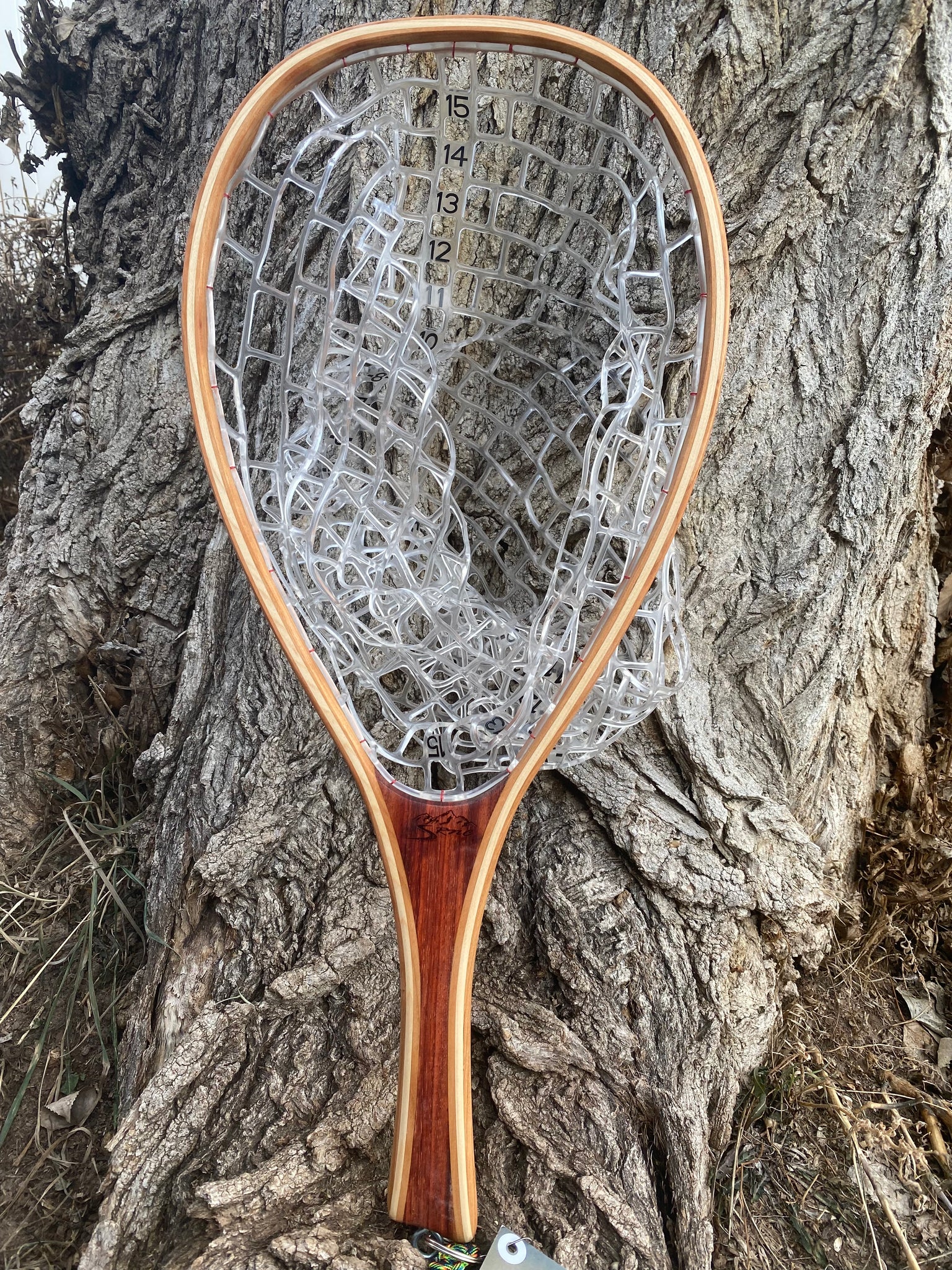 This is the actual net you will receive. The handle is Paduk Wood. The hoop laminates are Cherry and Maple . This net has a fish friendly PVC bag that has ability to measure up to a 30 inch fish in the bag. All nets are finished with Tung oil for easy maintenance and to allow the natural color and feel of the wood.