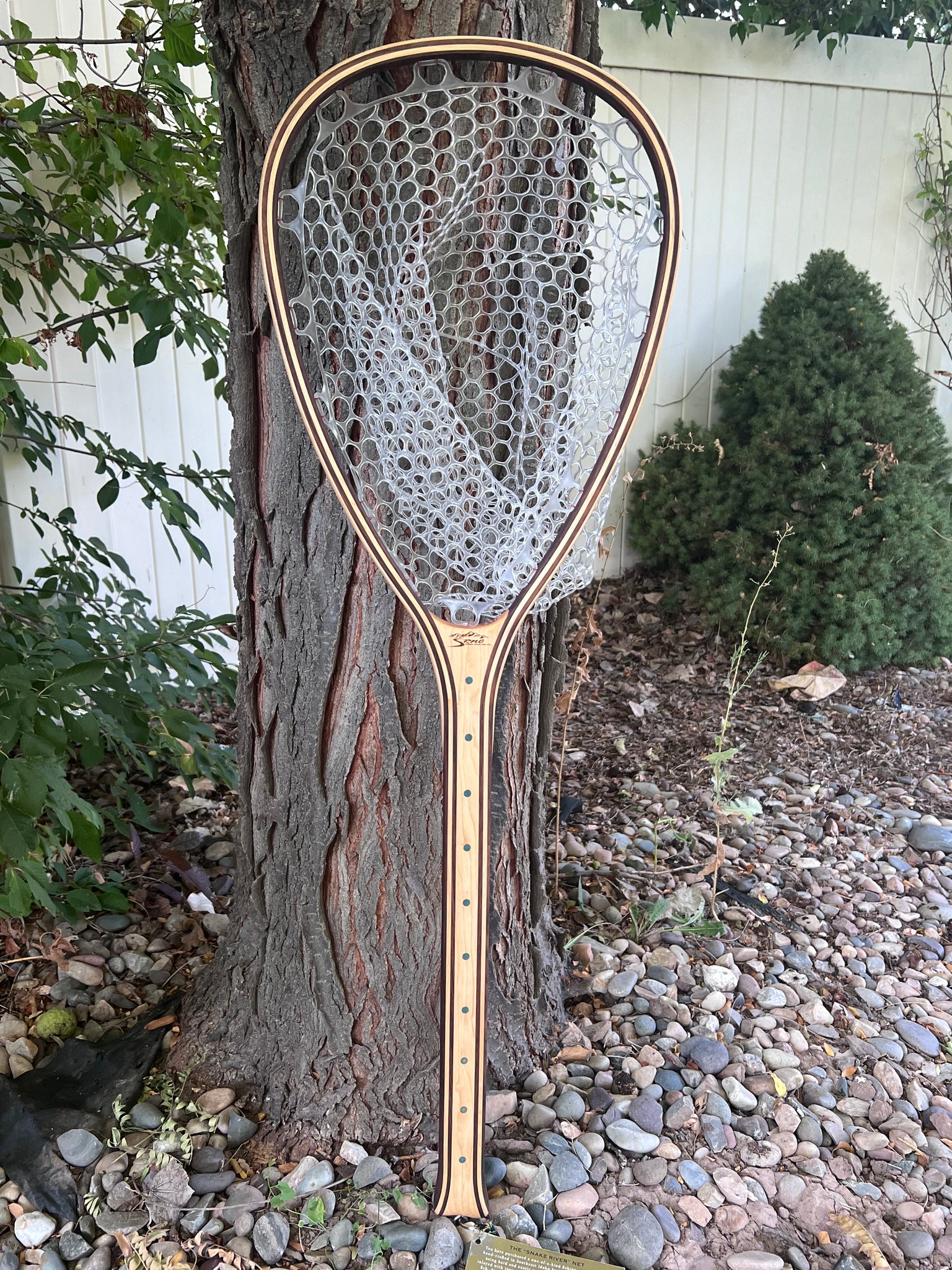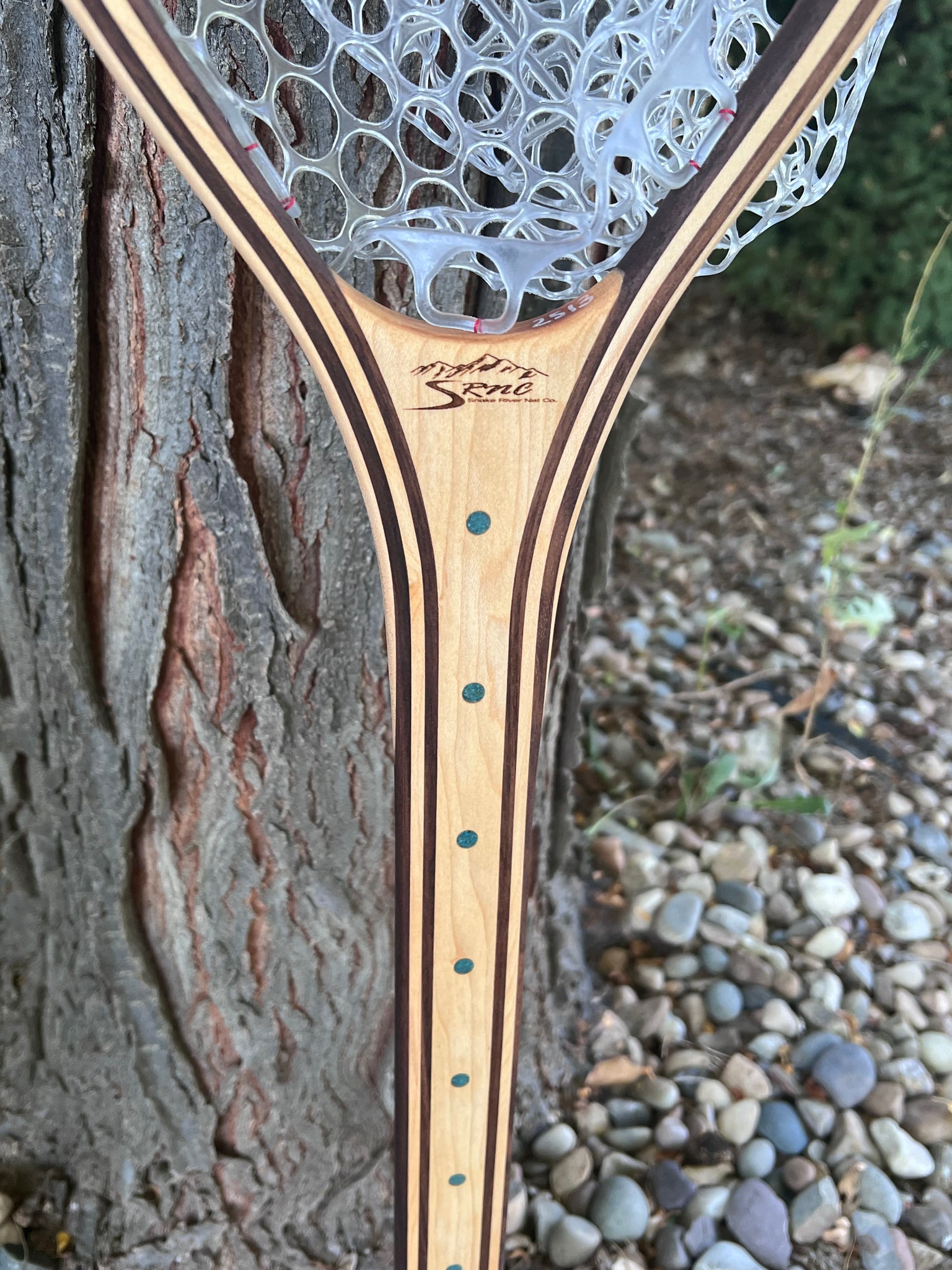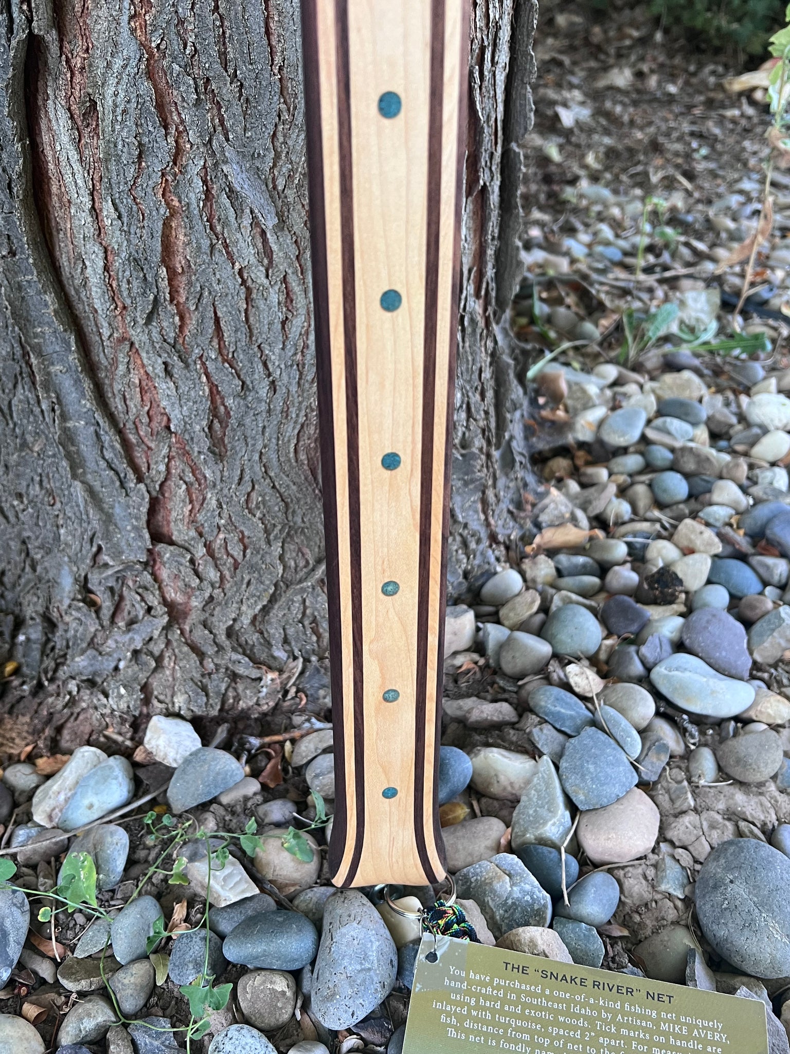 This net is designed for drift boats. The perfect length to store along side of the boat and not in the way of the rower. The handle widens at the end for a better grip. This net is made with 4 laminates that extend to the end of the handle. This net is beautiful and made to endure. This net is durable and strong, made with exotic hardwoods to incorporate beauty and strength within the hoop and handle. By using exotic woods, there are many grains and colors to choose from so that you will have a one-of-a-kind net . This net is inlaid with turquoise every 2″ along the handle for measuring your fish. The net has a clear, deep and fresh friendly bag. Use of tung oil highlights the natural beauty of the wood and allows easy maintenance of the Net.