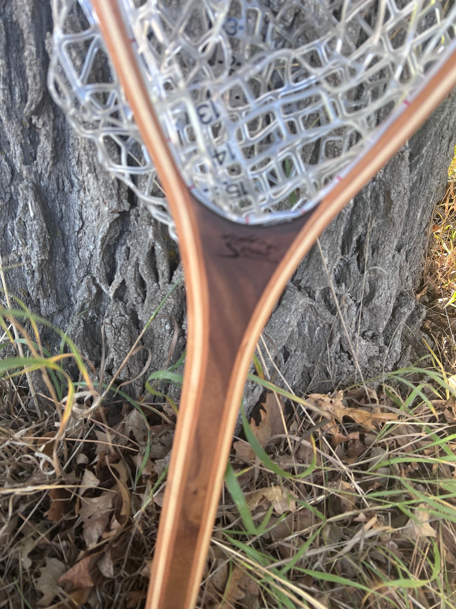 This net is very versatile. It can be used for float tubes, longer handle wade fishing or tenkara fishing. The handle is not too long making it easy to store and maneuver. The net style is designed with a flat top and wide hoop to make landing a fish fast and easy. The net is durable and strong made with exotic hardwoods to incorporate beauty and strength within the hoop and the handle. By using exotic woods, there are many grains and colors to choose from so that you will have a one-of-a-kind net. This net has a bag that is fish friendly, hooks do not get caught in this bag. This bag also has a way to measure the fish up to 30″. Use of tung oil highlights the natural beauty of the wood and allows easy maintenance of the net.