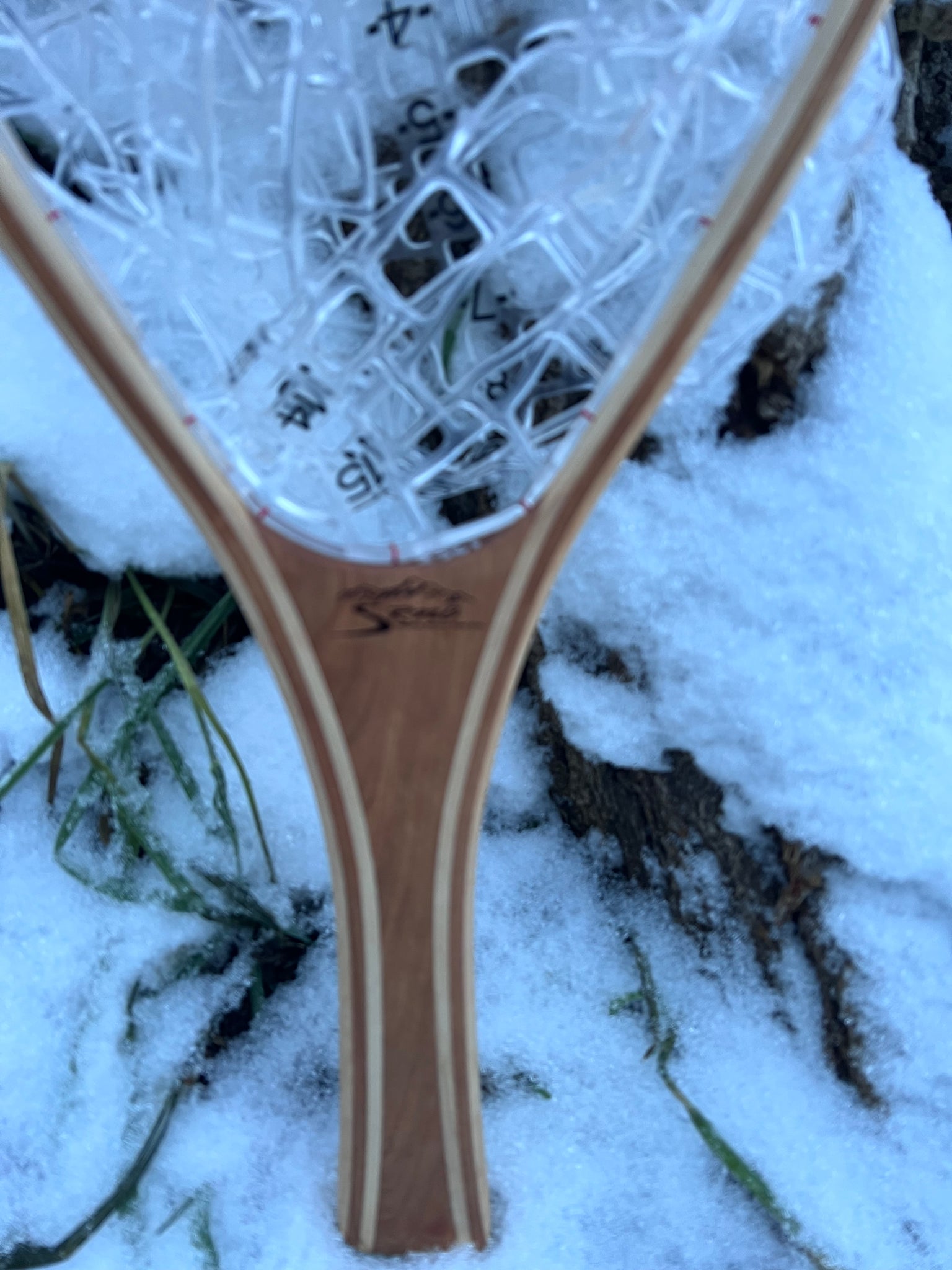 This is a traditional style net, lightweight and easy to handle while wade fishing. This net style is designed with a flat top and wide hoop to make landing a fish fast and easy. The net is durable and strong, made with exotic hardwoods to incorporate beauty and strength within the hoop and the handle. By using exotic woods, there are many grains and colors to choose from so that you will have a one of a kind Net. This Net has a bag that is fish friendly, hooks do not get caught in this bag. This bag also has a way to measure the fish up to 30″. Use of tung oil highlights the natural beauty of the wood and allows easy maintenance of the net.