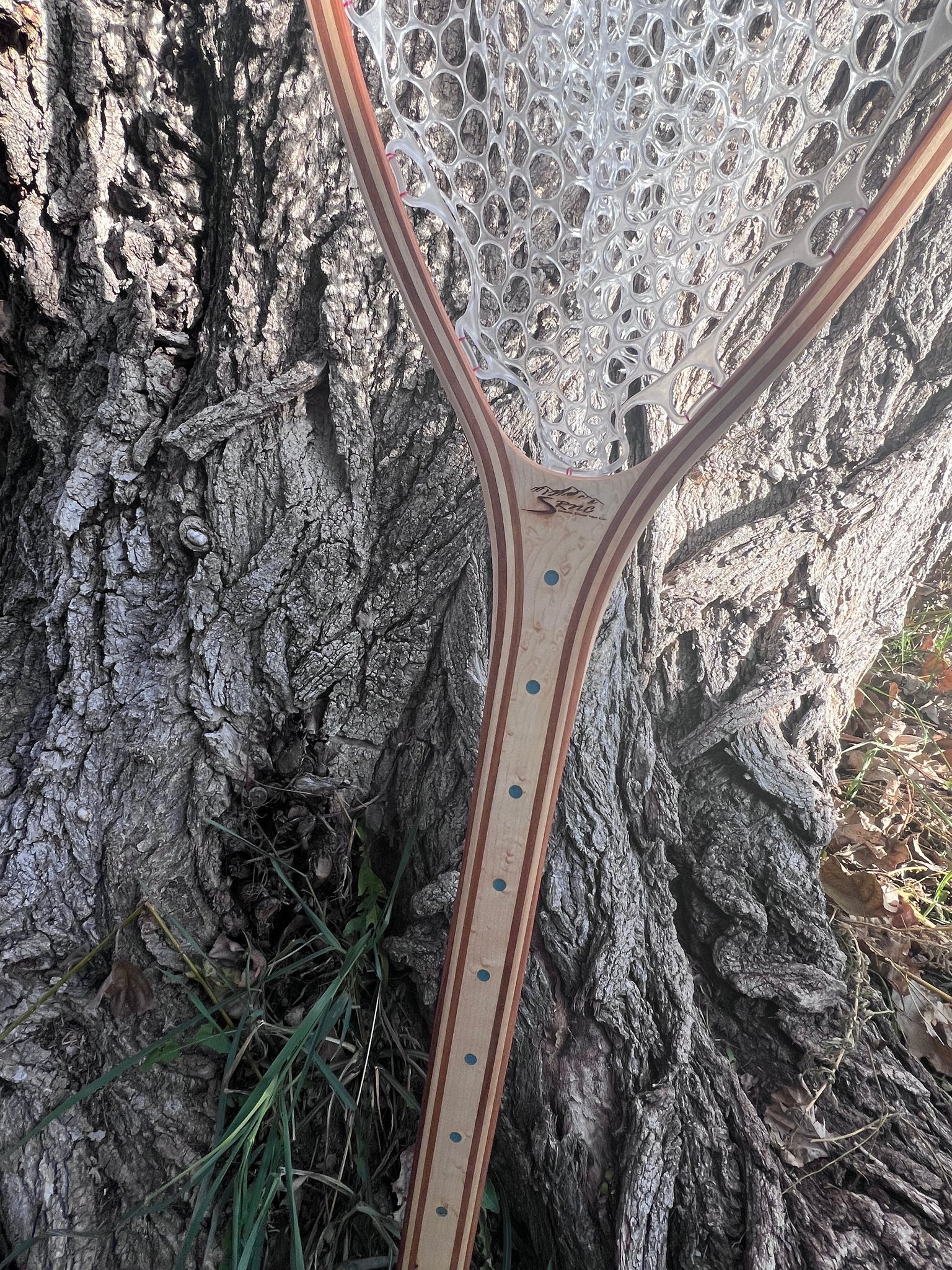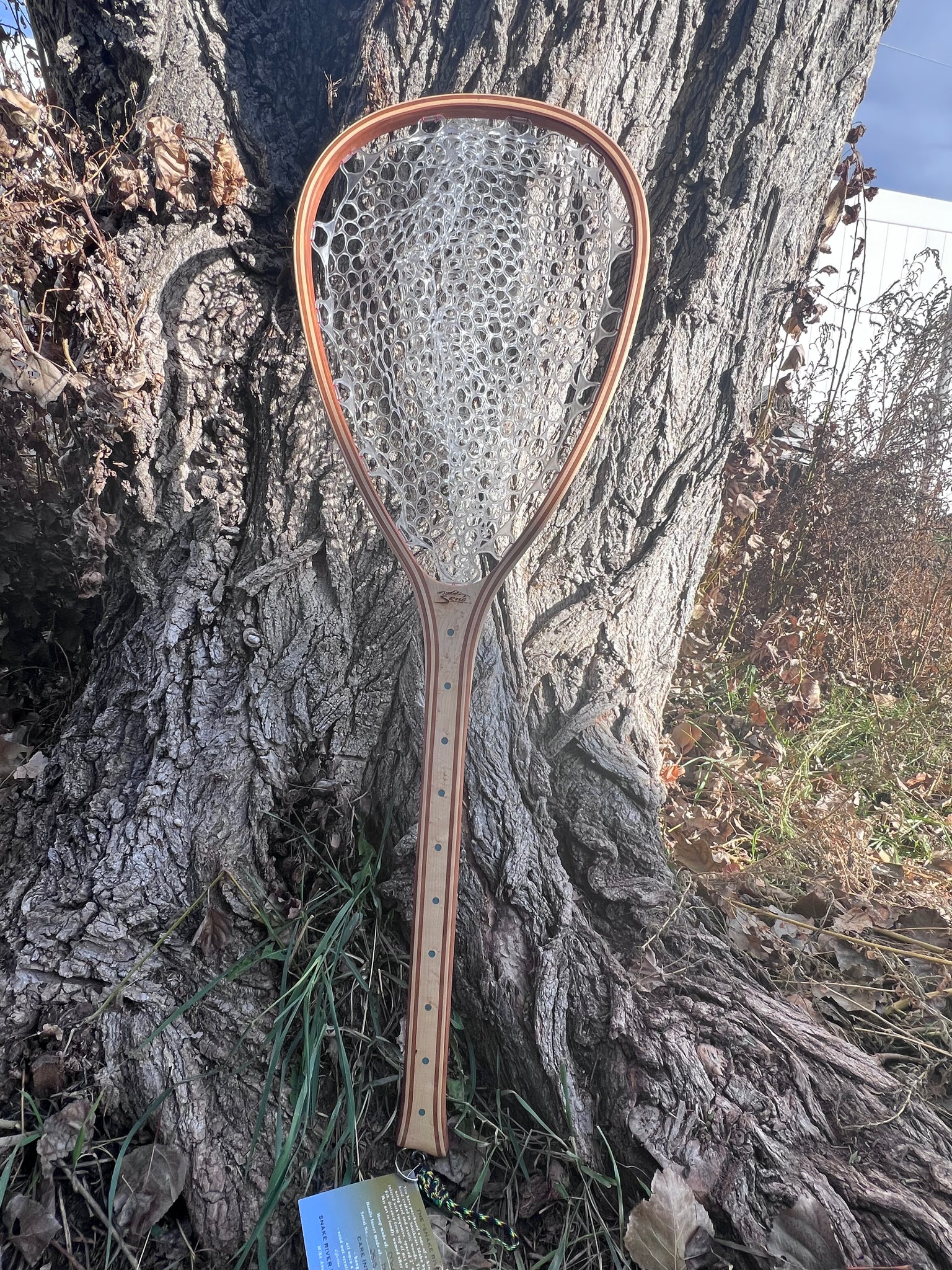 This net is designed for drift boats. The perfect length to store along side of the boat and not in the way of the rower. The handle widens at the end for a better grip. This net is made with 4 laminates that extend to the end of the handle. This net is beautiful and made to endure. This net is durable and strong, made with exotic hardwoods to incorporate beauty and strength within the hoop and handle. By using exotic woods, there are many grains and colors to choose from so that you will have a one-of-a-kind net . This net is inlaid with turquoise every 2″ along the handle for measuring your fish. The net has a clear, deep and fresh friendly bag. Use of tung oil highlights the natural beauty of the wood and allows easy maintenance of the Net.